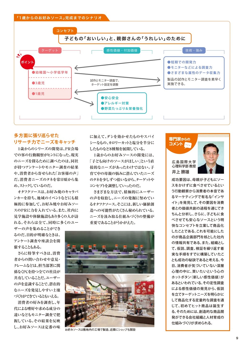 オタフクソースの事例は、ソースを “子どもに食べさせたくない” という同社が考えもしなかった課題の気づきからスタートし、親が子に「むしろ積極的に食べさせたい」という新たな感性価値をもつ商品へと昇華させている。既成概念に捉われず、柔軟にかつ粘り強くコンセプト及びターゲット設定を行う活動が結実した結果だ。